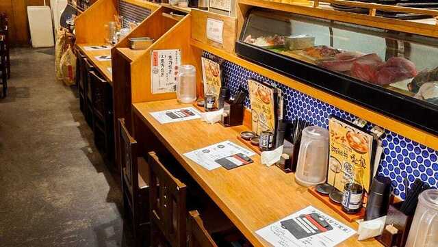横に長い店内。入り口にはカウンターがあり、お造り定食の刺身がのる桶みたいなザルの器が並んでいます。お店はほぼ満席でしたが、運良く並ばずに座れました。