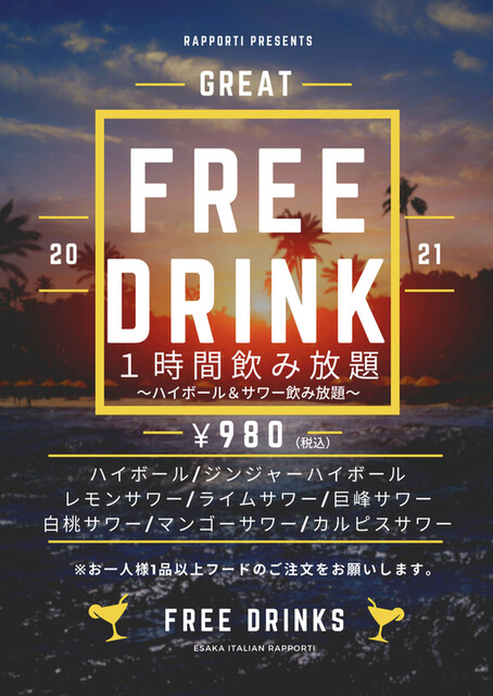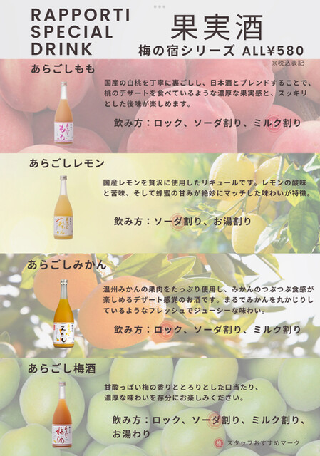 | ドリンク | 焼酎あり、ワインあり、カクテルあり |