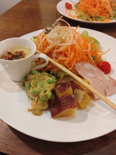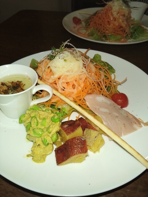 まずは、前菜から、にんじんをメインにしたサラダ、ドレッシングは、やや酸っぱめ!ちなみに私にはドンピシャ!妻はすこしすいーわとのこと!カレー風味の豆の煮物!ハム!スープ!どれもが最高!細かな説明がありましたが覚えきれません。
