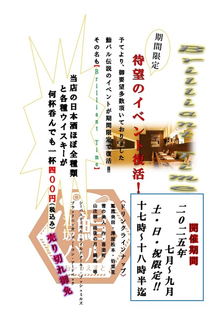 | ドリンク | 日本酒あり、焼酎あり、ワインあり、カクテルあり、日本酒にこだわる、ワインにこだわる |