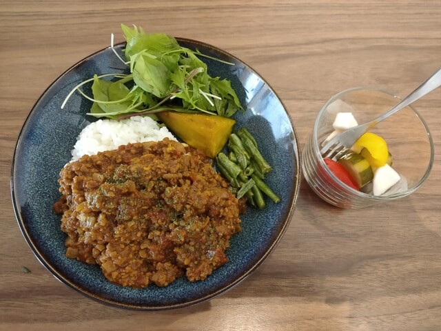 キーマカレーは、ピクルス、焼き野菜、サラダが付く。ピクルスは彩鮮やかで、焼き野菜は特にカボチャがかなり美味しかった。カレー自体は、辛...