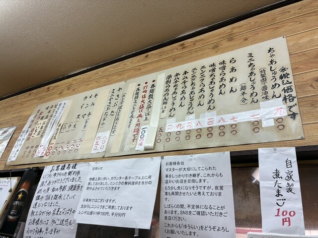 店内のカウンターで注文。メニューはカウンターの上の壁に書いてあります。ラーメンの種類は定番が醤油、ほかに味噌、にんにく、キムチのらあめんもありました...