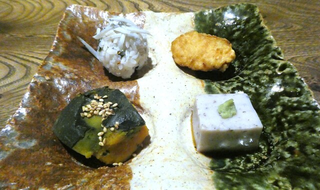 前菜 ①あんこう唐揚げ ②シラス手毬寿司 ③小豆豆腐 ④南瓜ピリ辛煮