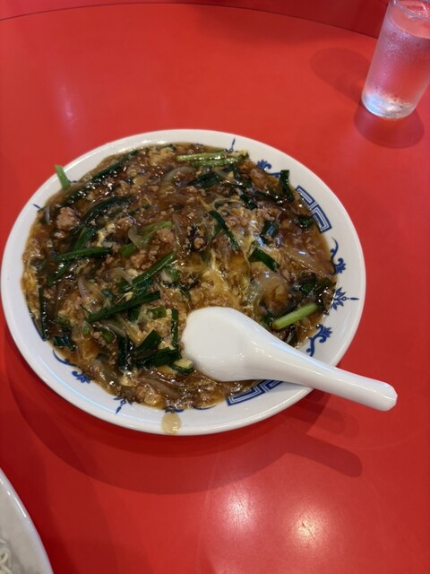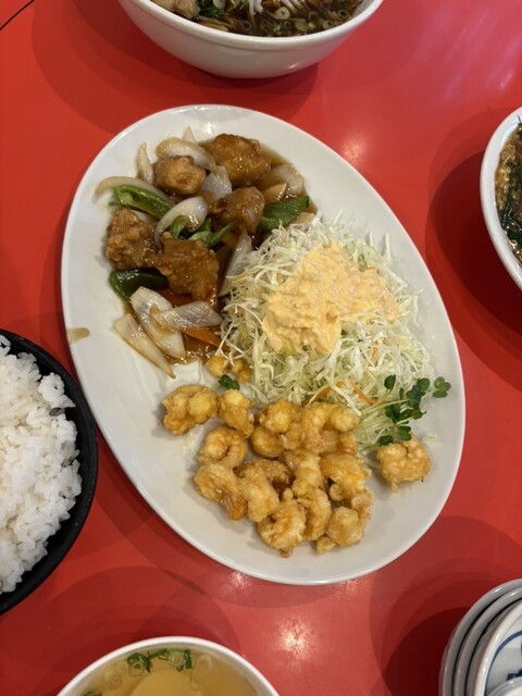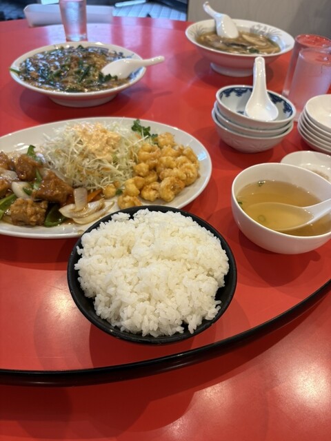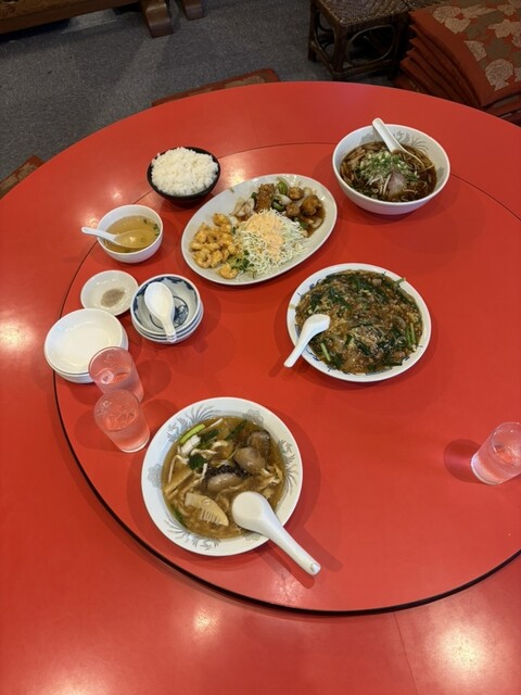 阪急茨木市駅下車徒歩4分のところにある当店。駐車場あり。しかし、すぐに満車になるから注意が必要。当店は、創業50年以上の茨木の老舗町中華のお店。大きな看板は、中華街にあるお店のような雰囲気。店内はそこそこ広くて、テーブル席や円卓の座敷がある。座敷に案内してもらった。隣りの宴席がかなり盛り上がっていた。週末の14時前に予約なしで入店。ランチは14時を過ぎると注文できなくなるとのこと。危なかった。タブ...