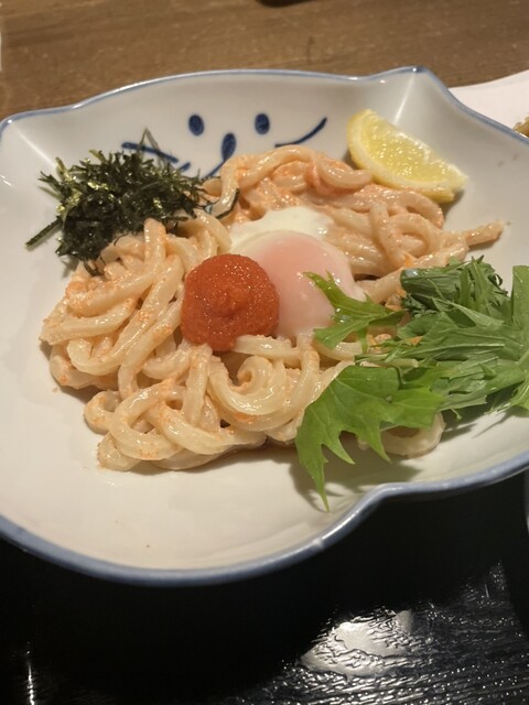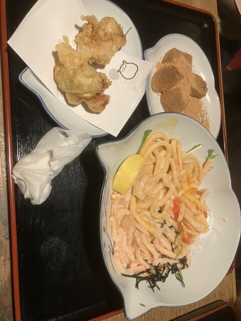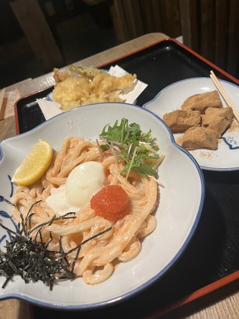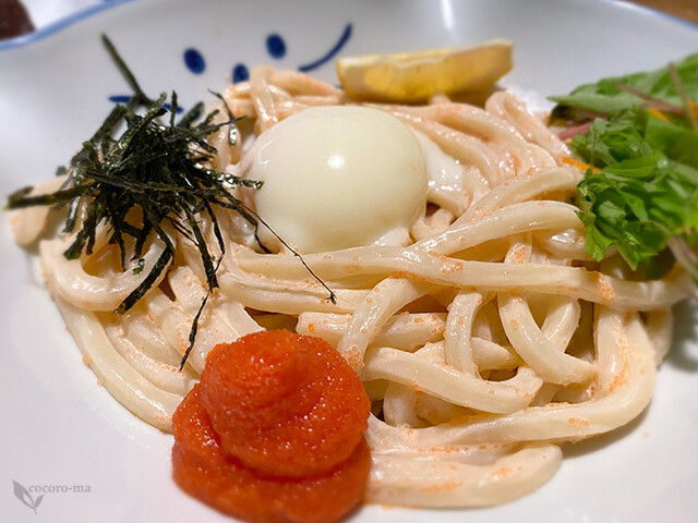 今回選んだのは、クリーミー明太うどんのセット。温かいうどんでお願いしたのですが、店内が少し肌寒かったこともあり、これが大正解!明太子のほどよい塩気とクリーミーなスープが絶妙にマッチして、心までほっこり温まりました。