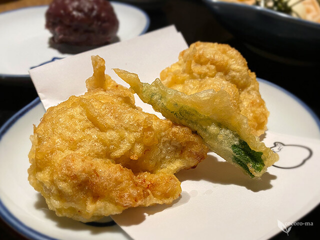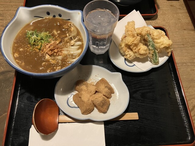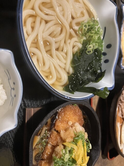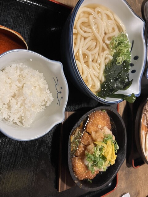 セットには、大きな鶏天が2つとオクラの天ぷらがついていてボリューム満点。さらに、サイドメニューはご飯物 o...