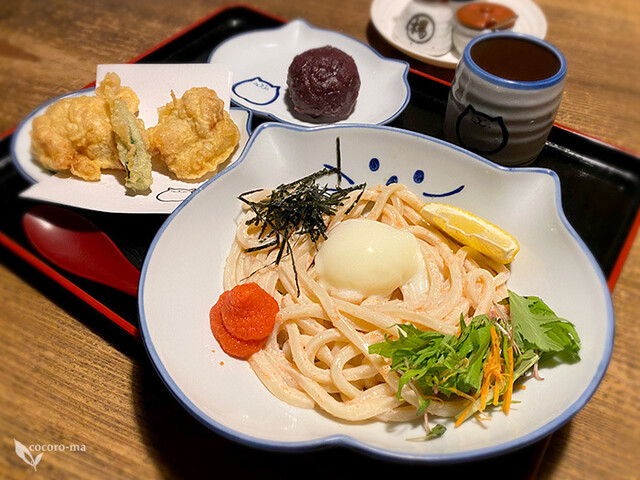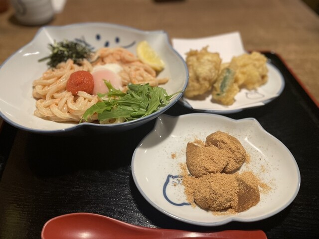 完全個室でゆったりといただく「クリーミー明太子うどん・鶏天・黒米おはぎ」