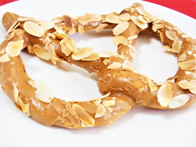 プレッツェルの形に焼き上げたパンに、アーモンドとキャラメルチョコを