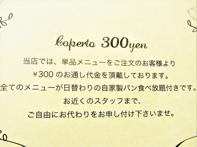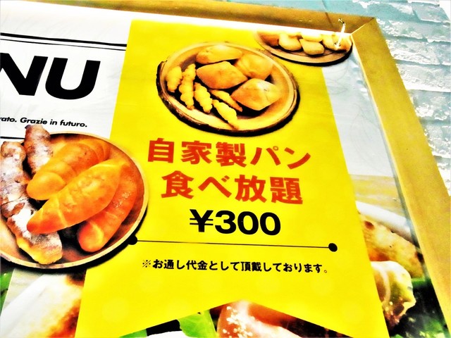 コースはコース料金内で、アラカルトはお通し代¥300で、自家製パン食べ放題。