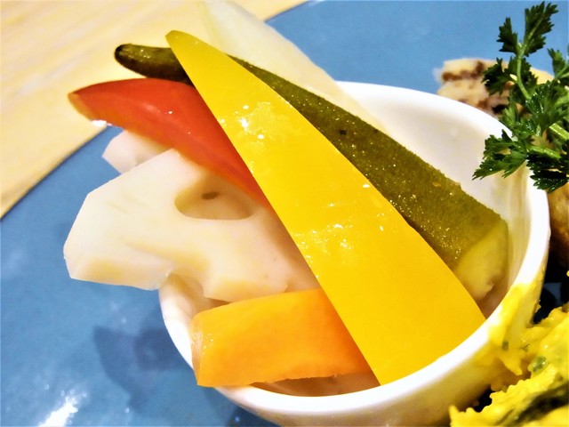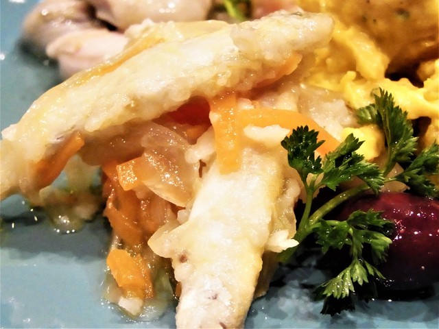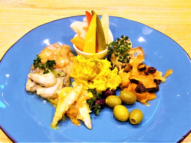 ワカサギのエスカベッシュ、キャロットラペ、オリーブ、レーズンバター