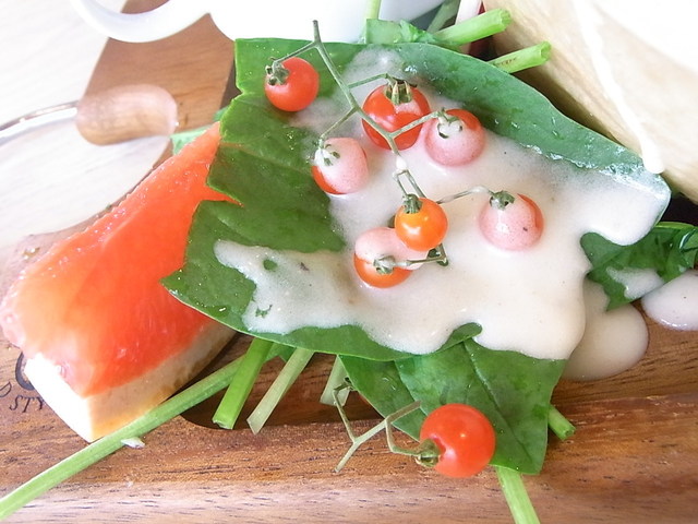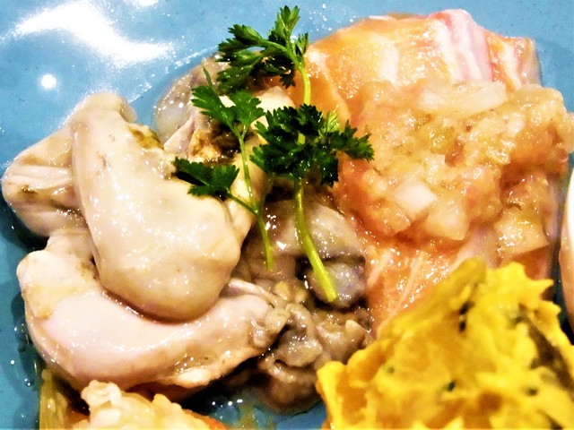 ピクルス、サーモンのマリネ、生牡蠣の何か、カボチャのサラダ