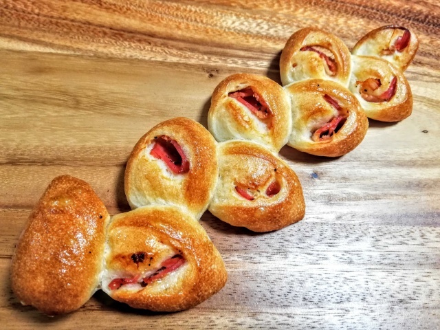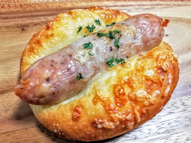 調理パンにマスタードとタイムをあわせて、ウィンナーを丸ごとのせチーズと共に焼き上げました・・・とのコト