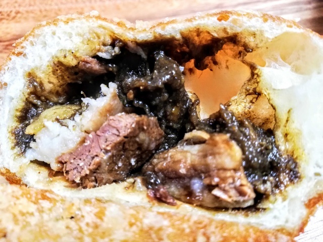 時間が経ってもずっとカリカリ。甘辛く炊いた牛スジを黒カレーと共にたっぷり包みました・・・とのコト