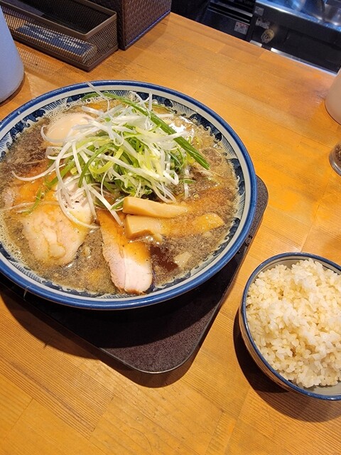 太い麺をワシワシとして、煮干しの濃い醤油スープが美味い。ごはんは、白ごはんってかいてあるけど、玄米入りかな?