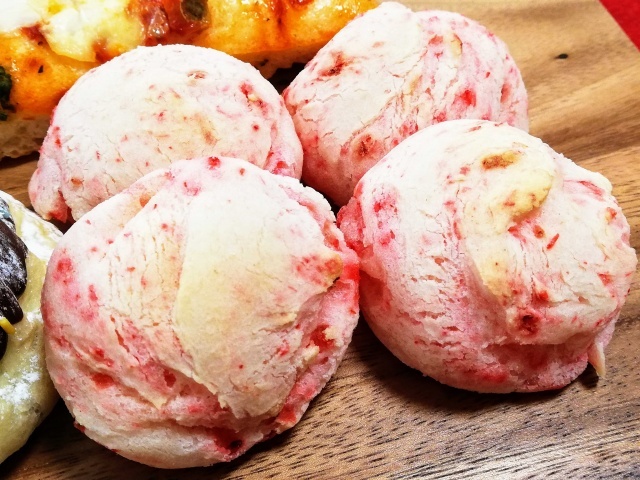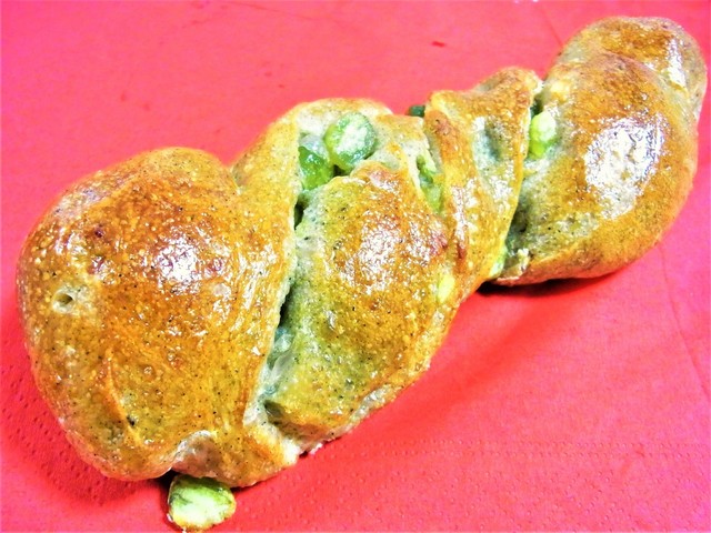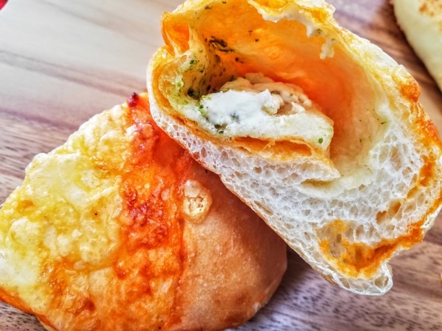 フランスパン生地にバジル、トマト、チーズを包み香ばしく焼き上げました・・・とのコト