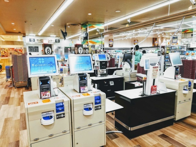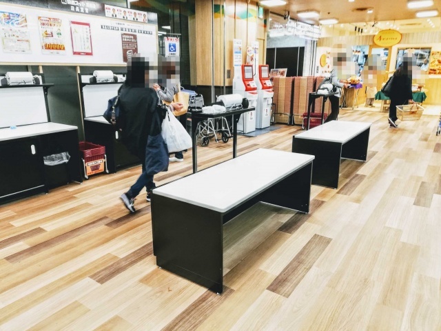 全部かどうか分かりませんが、レジは半セルフ式に。商品棚や平台やレジ台もそうだけど、サッカー台もコンパクトなサイズになっていて、結果、通路が広くなった。カートが差し込めるよう、低い。