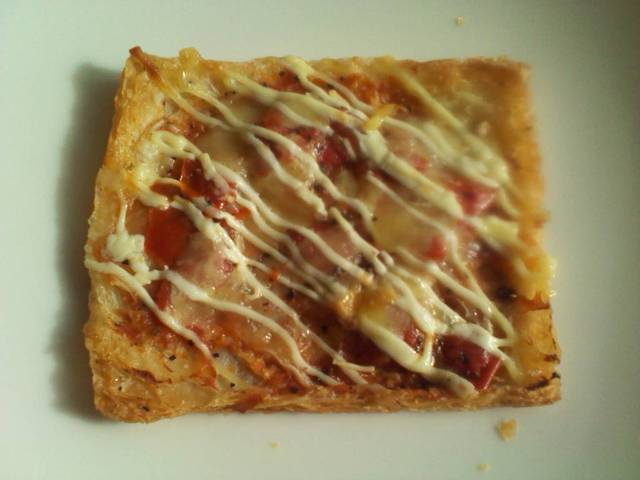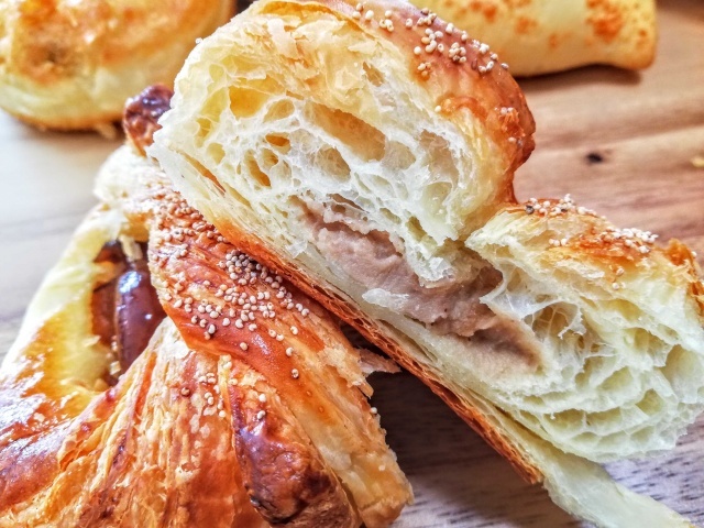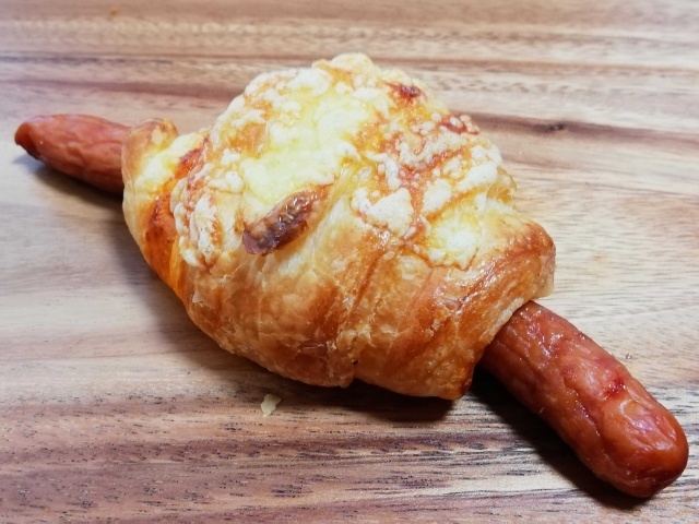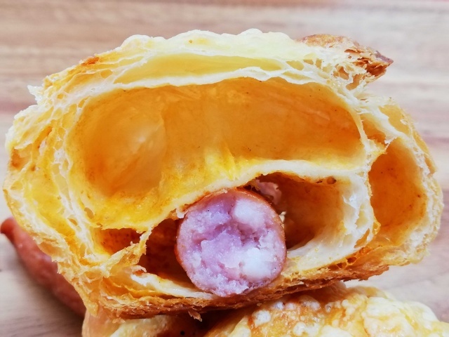 サクサクのクロワッサン生地にスモークウインナーを挟み、ピザソースとカラシマヨネーズで味付けしました。