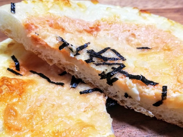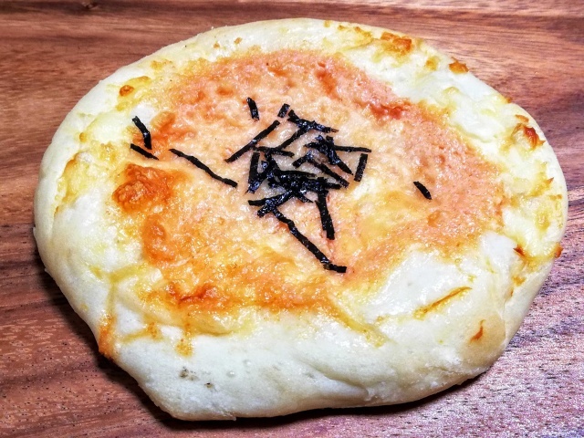 博多明太ソースとチーズをのせ焼き上げました。仕上げに刻み海苔をトッピング・・・とのコト