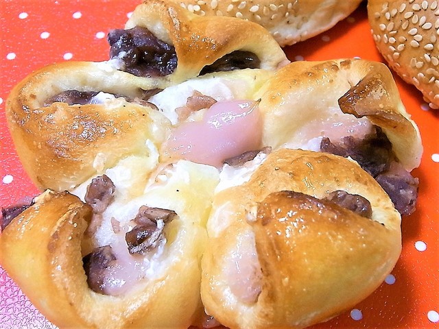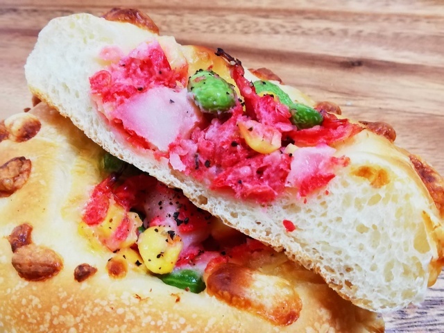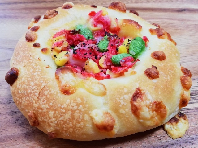 チーズのパンにコーン、枝豆、小海老、ポテトサラダをトッピングし、色鮮やかに仕上げました。