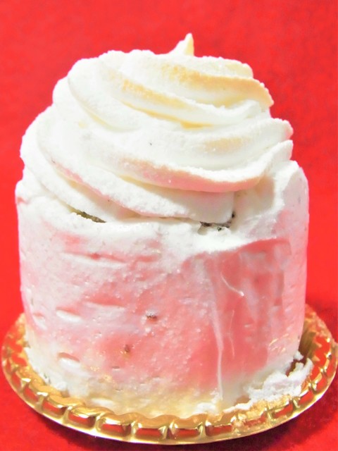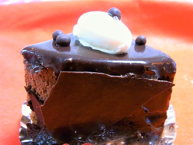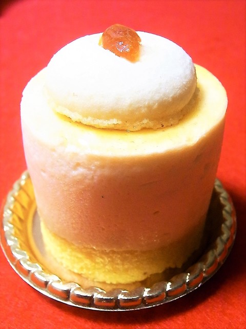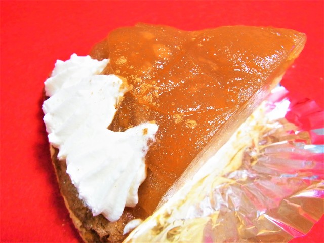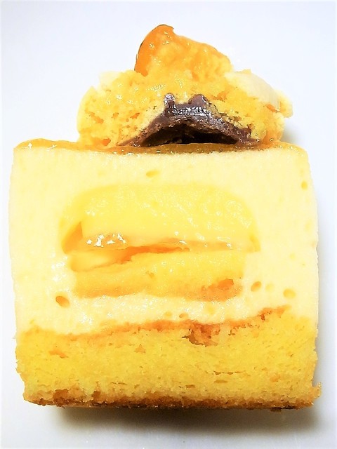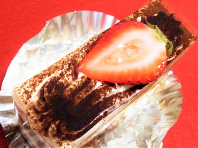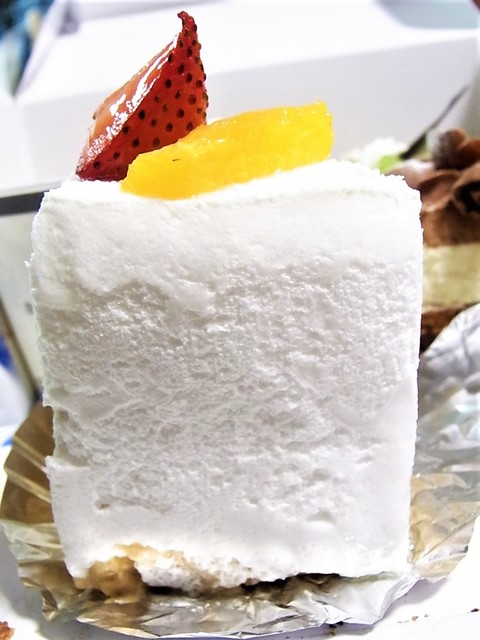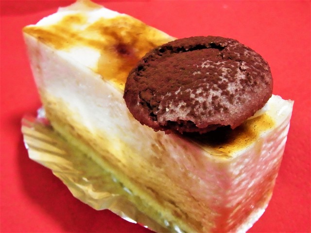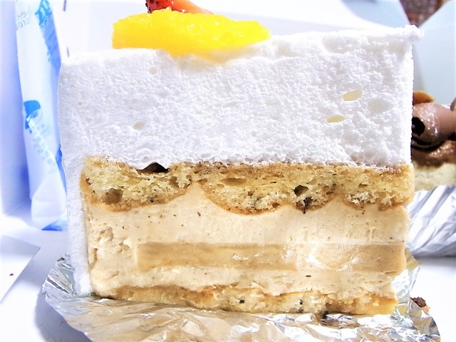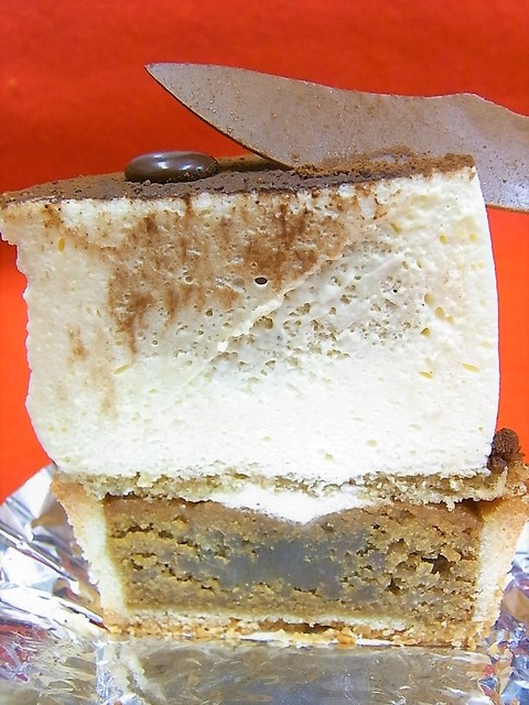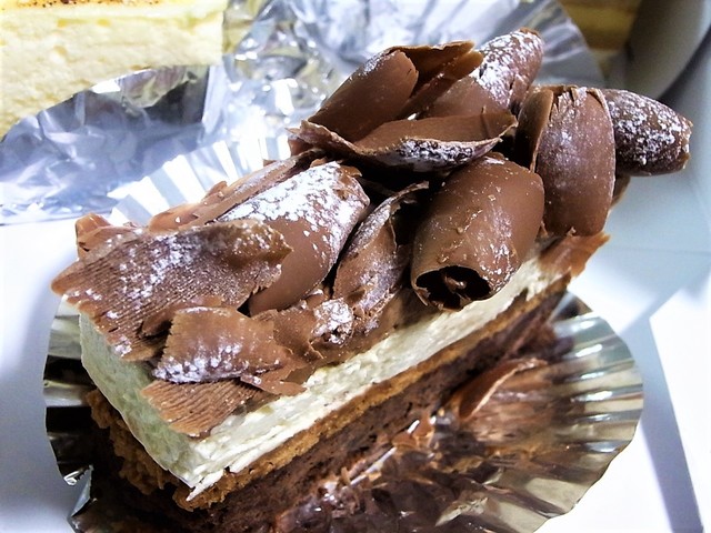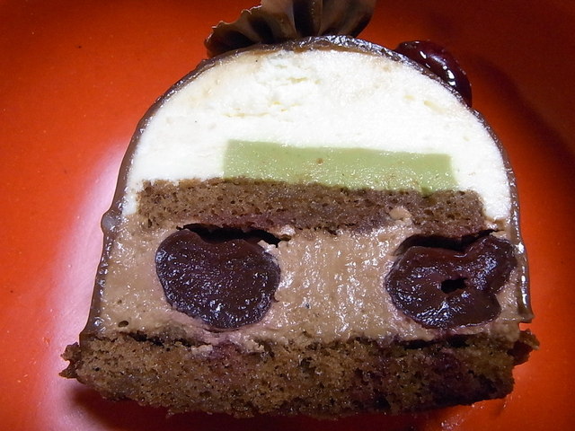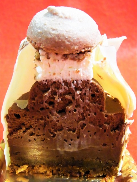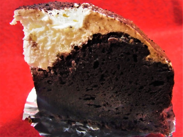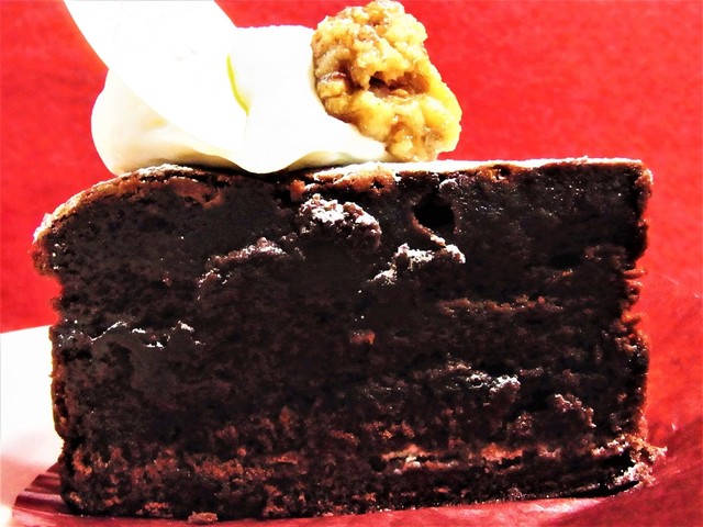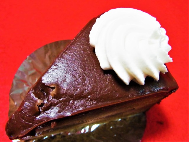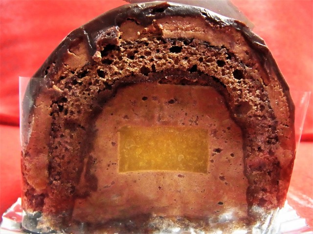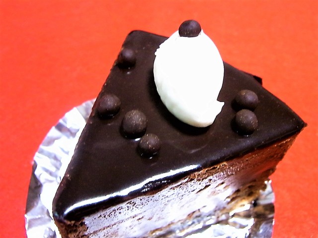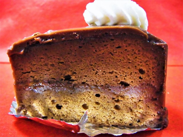 濃厚なチョコレートケーキと、ふわふわの淡雪のようなホイップをチョコで覆っている。固めのホイップを、というケースはなくもないけど、こんなに柔らかいホイップをというのは初めて巡り会ったかも。覆っているチョコも、固まりきっていない柔らかいもの。こういう細工って可能なのね~と感心。もちろん、見た目通り、味のほうも一級品☆