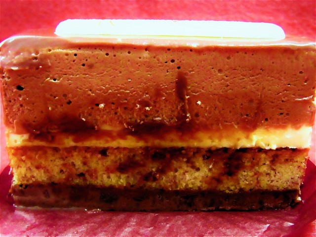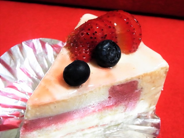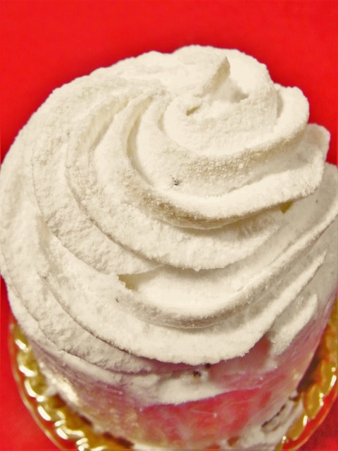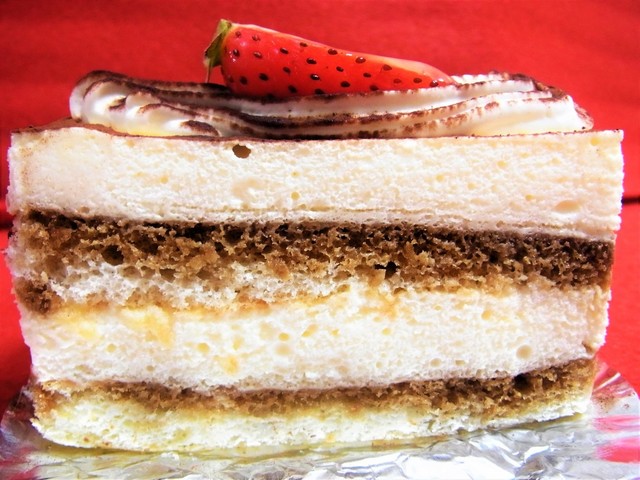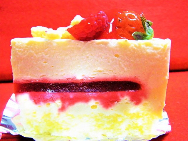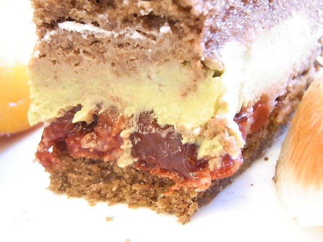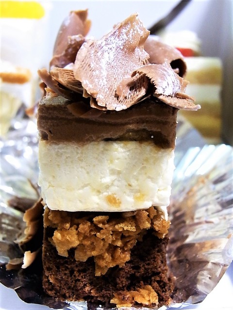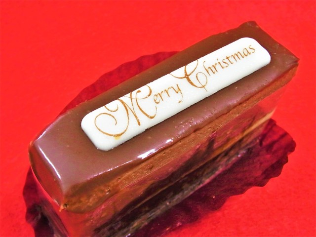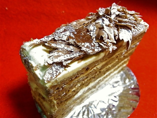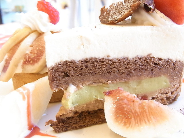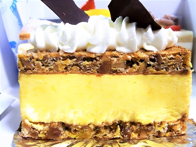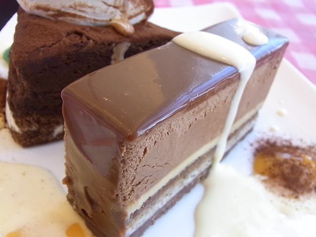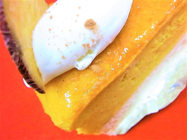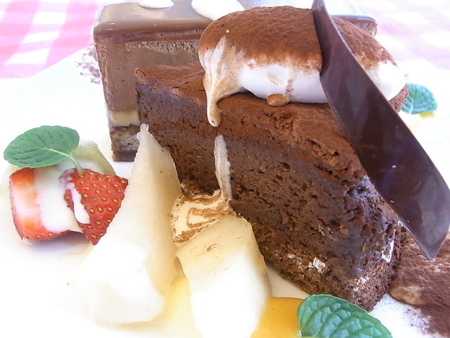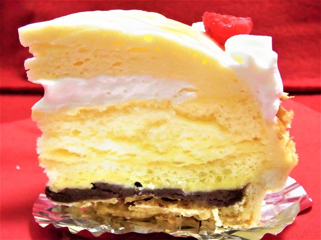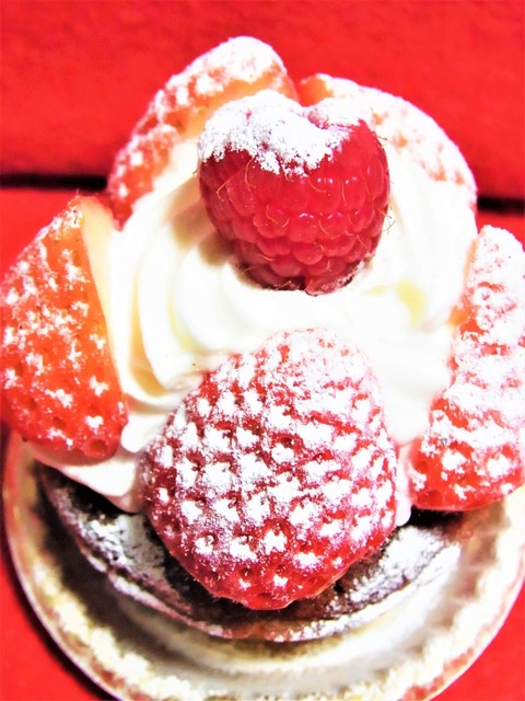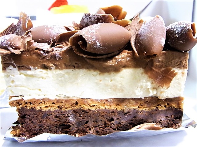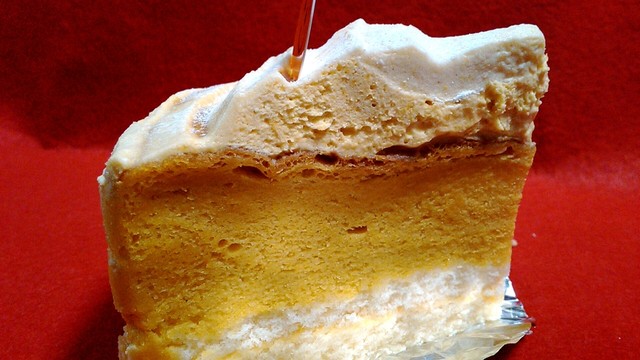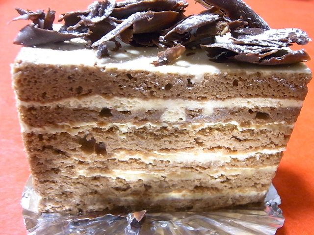 濃厚なチョコレートケーキと、ふわふわの淡雪のようなホイップをチョコで覆っている。固めのホイップを、というケースはなくもないけど、こんなに柔らかいホイップをというのは初めて巡り会ったかも。覆っているチョコも、固まりきっていない柔らかいもの。こういう細工って可能なのね~と感心。もちろん、見た目通り、味のほうも一級品☆
