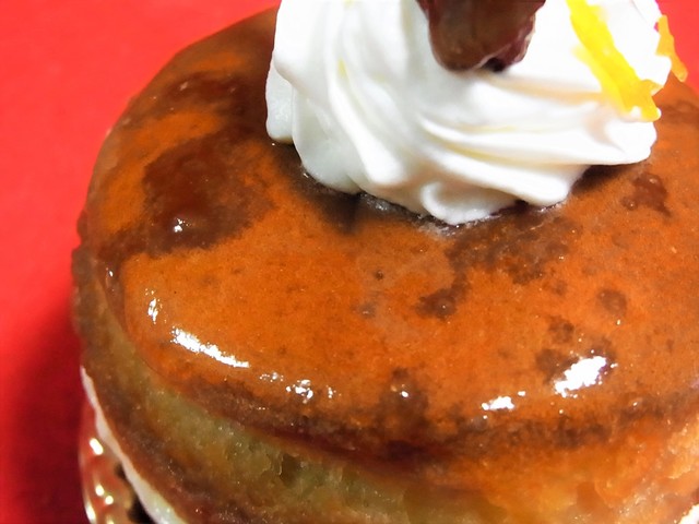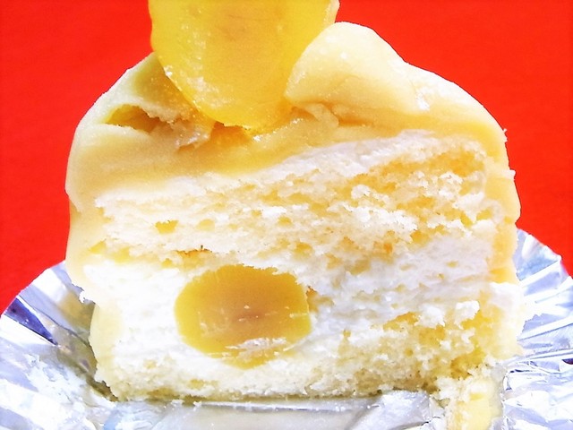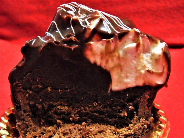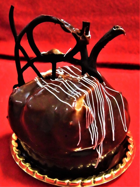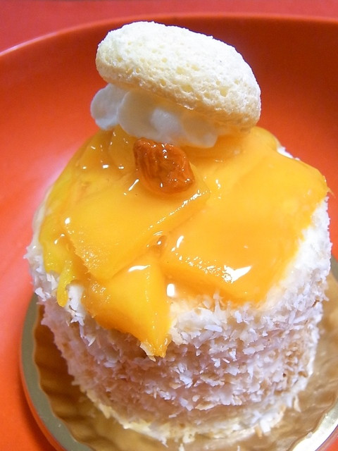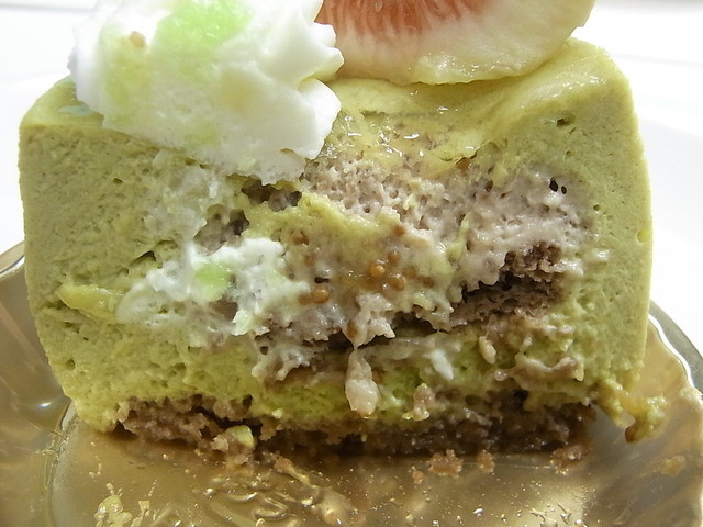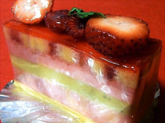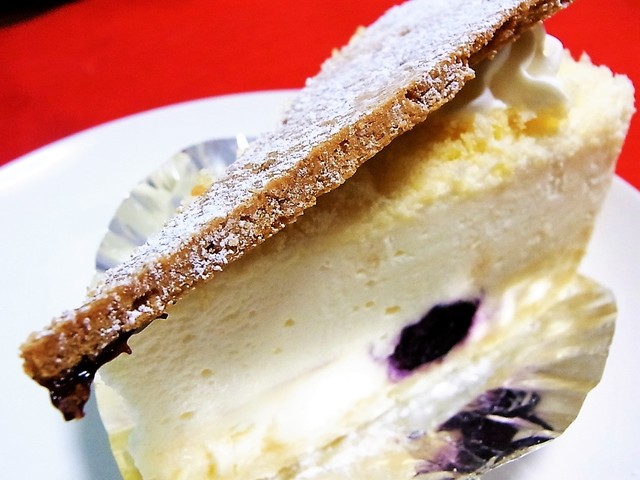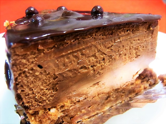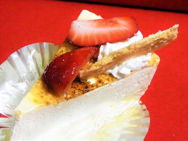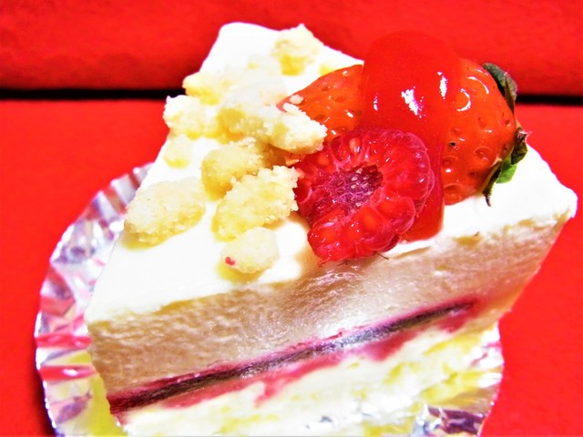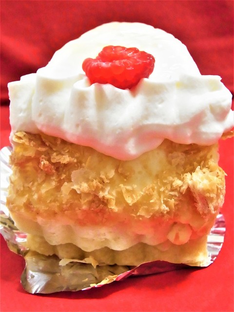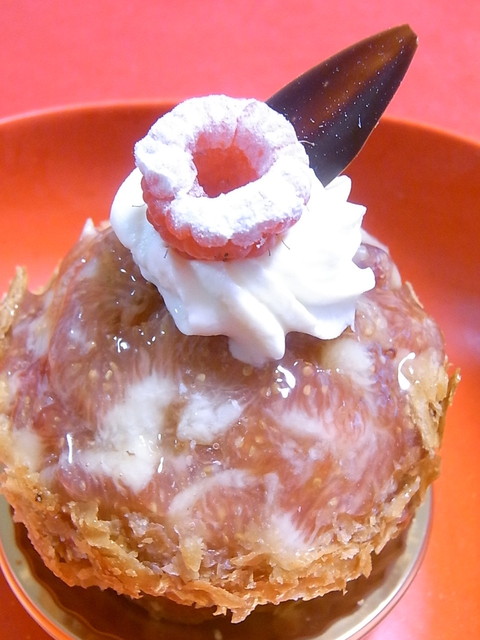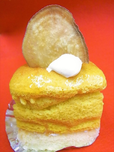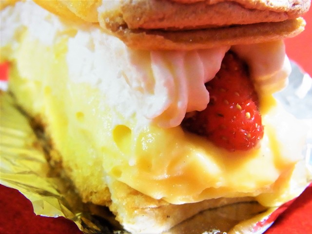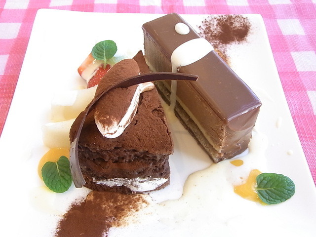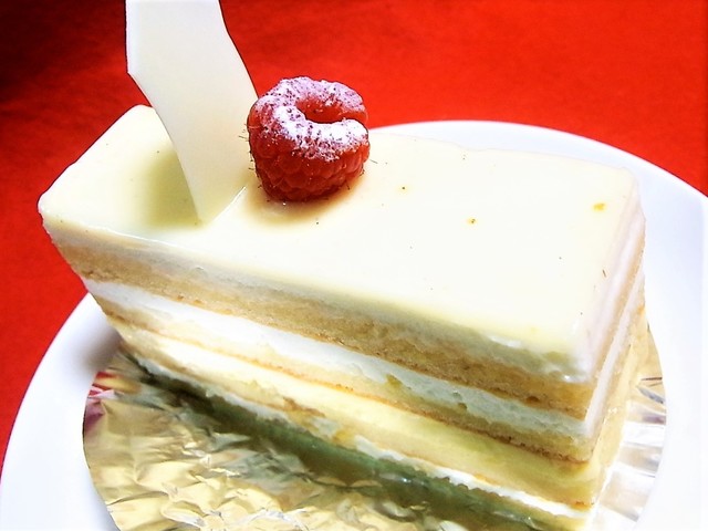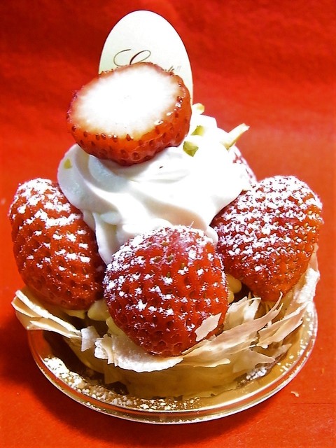 濃厚なチョコレートケーキと、ふわふわの淡雪のようなホイップをチョコで覆っている。固めのホイップを、というケースはなくもないけど、こんなに柔らかいホイップをというのは初めて巡り会ったかも。覆っているチョコも、固まりきっていない柔らかいもの。こういう細工って可能なのね~と感心。もちろん、見た目通り、味のほうも一級品☆