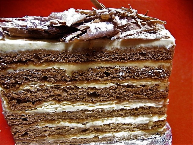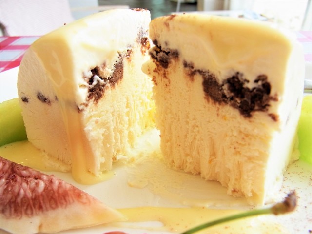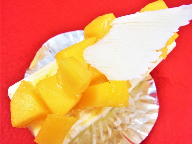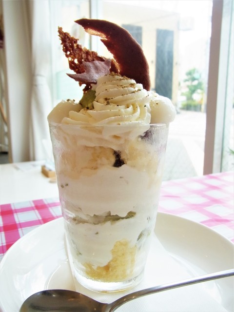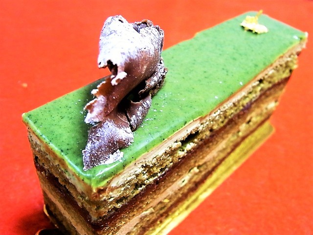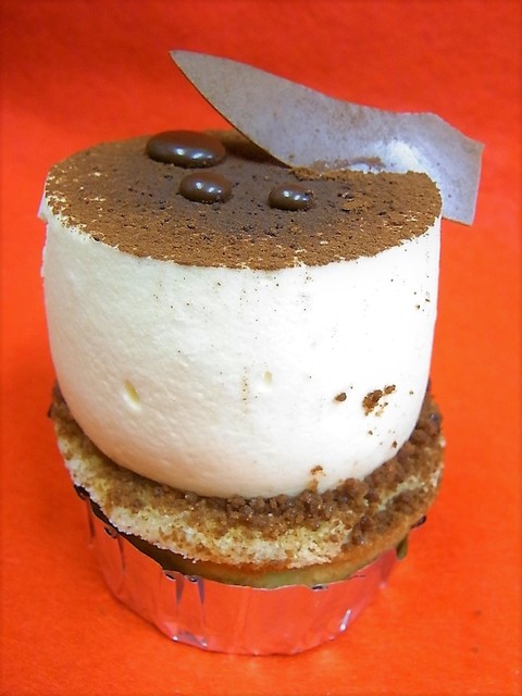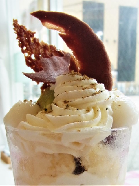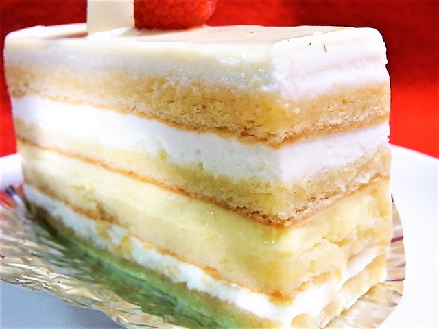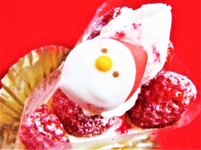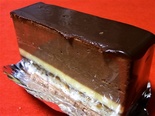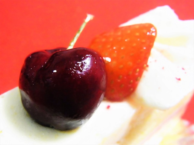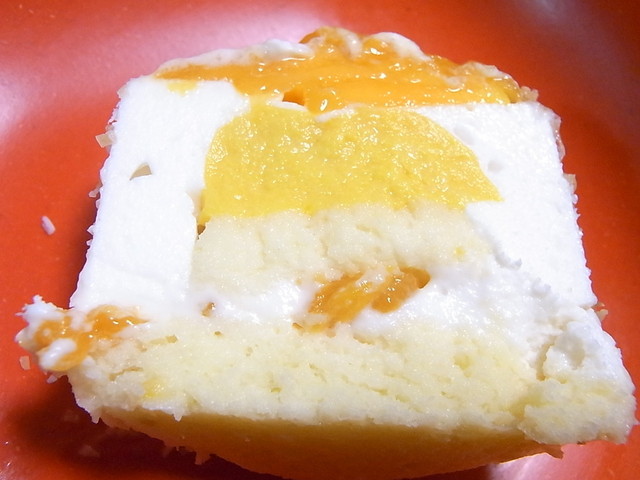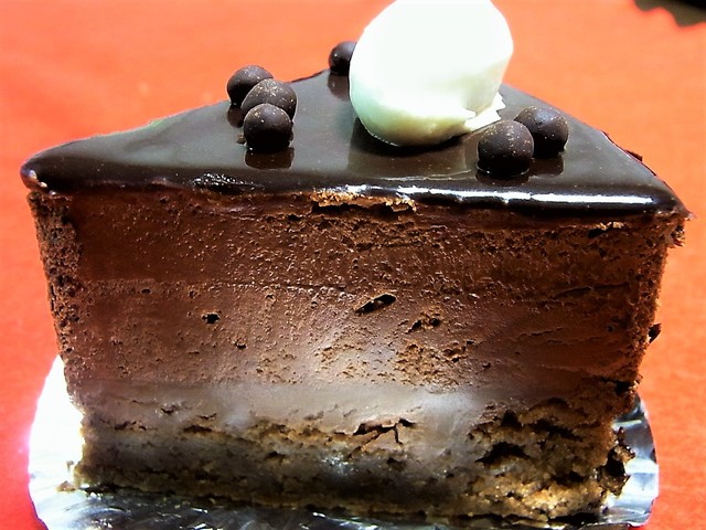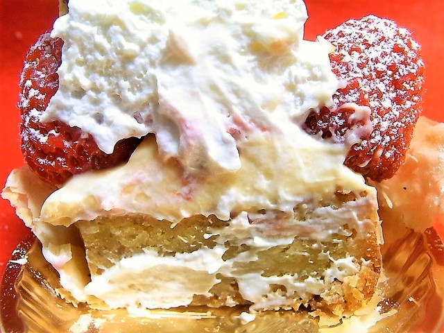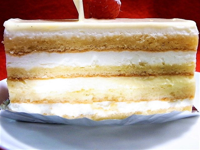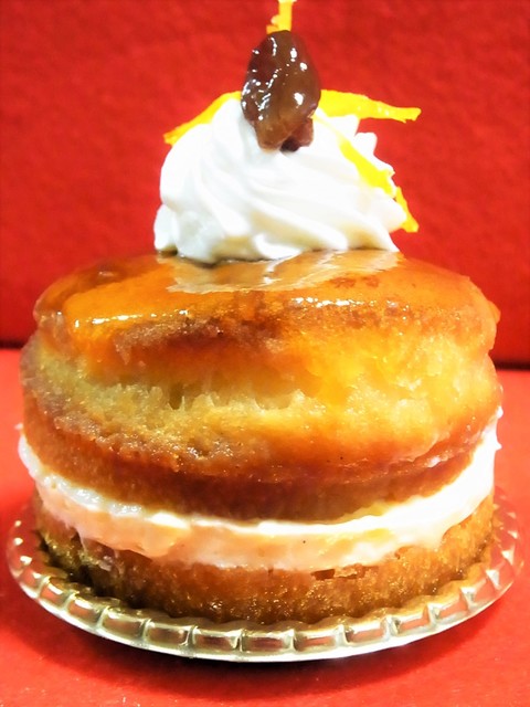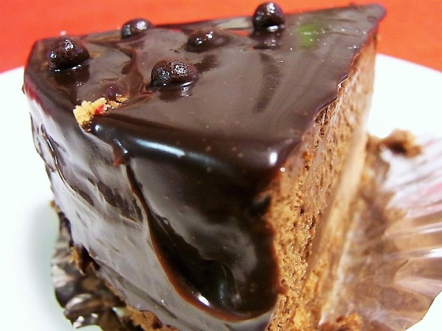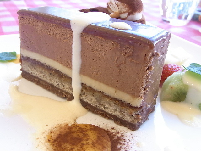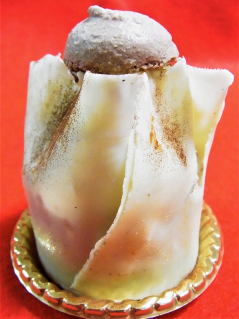濃厚なチョコレートケーキと、ふわふわの淡雪のようなホイップをチョコで覆っている。固めのホイップを、というケースはなくもないけど、こんなに柔らかいホイップをというのは初めて巡り会ったかも。覆っているチョコも、固まりきっていない柔らかいもの。こういう細工って可能なのね~と感心。もちろん、見た目通り、味のほうも一級品☆