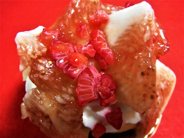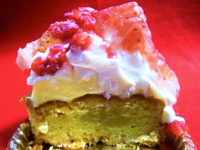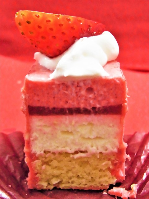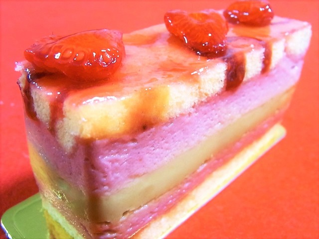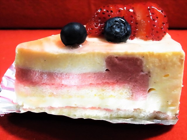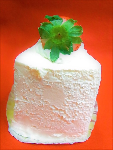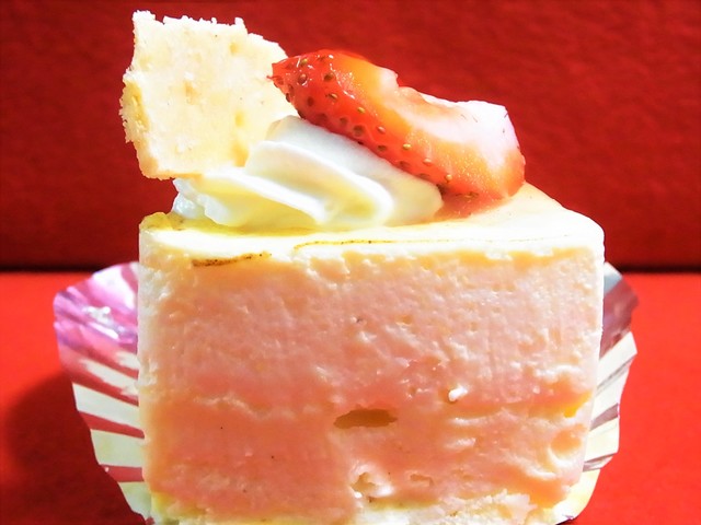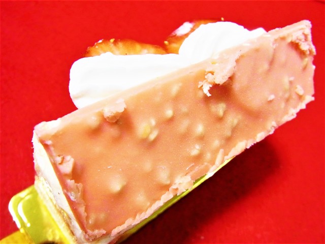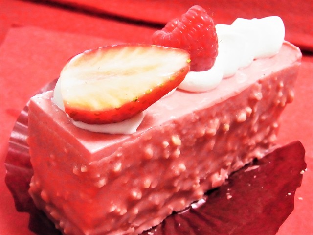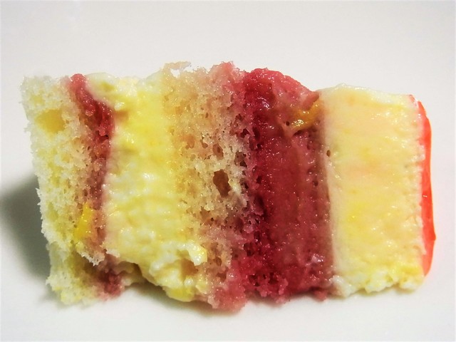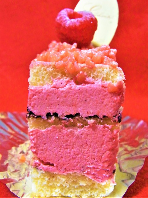コレも、中の苺のムースがとっても柔らかい。ただし、コーティングの苺チョコはシッカリ固まっているので、口に入れると、噛んだらプチっと弾けて果汁が溢れ出る完熟フルーツのよう。苺の風味も強く、それを和らげるマスカルポーネとの相性も良い☆