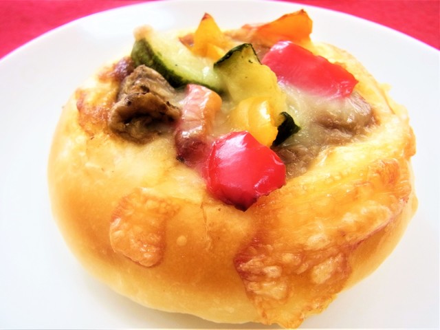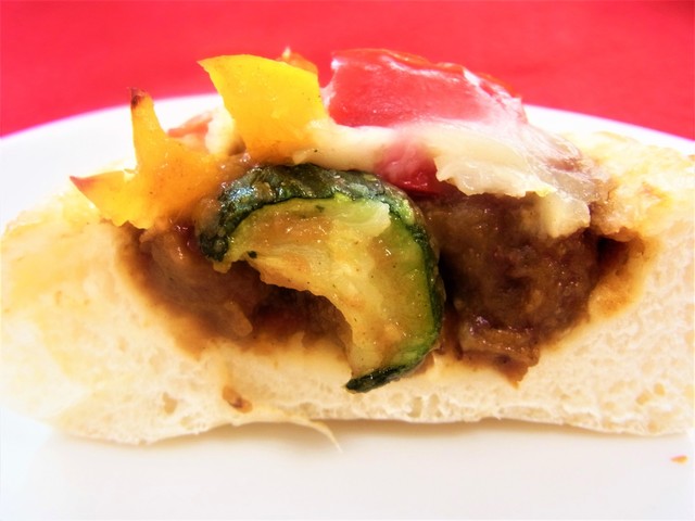カレーフィリングにグリル野菜とチーズを合わせた、具だくさんのカレーパンです・・・とのコト、のっかってるのが夏野菜っぽいけど、カレーが辛口で美味☆
