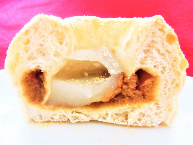 沖縄県産黒糖を練り込んだもっちり生地に、きなこクリームを包み、求肥をのせて焼き上げ、きなこシュガーをトッピングしました・・・とのコト きなこきなこしていて美味☆