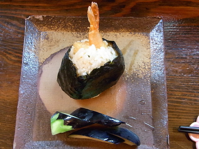 海老天を天つゆ味?のごはんで握って海苔で巻いて。