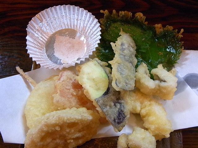 天ぷらは、鱧、茄子、蓮根、大葉、玉葱、新生姜。