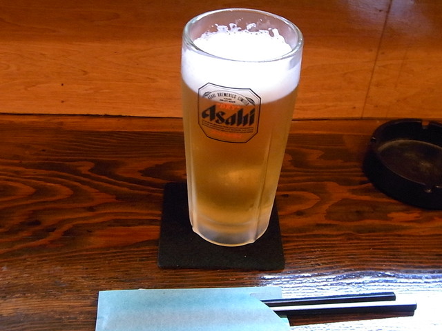 生中(スーパードライ)・胡瓜の酢の物・天ぷら盛り合わせ。