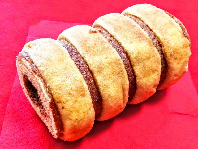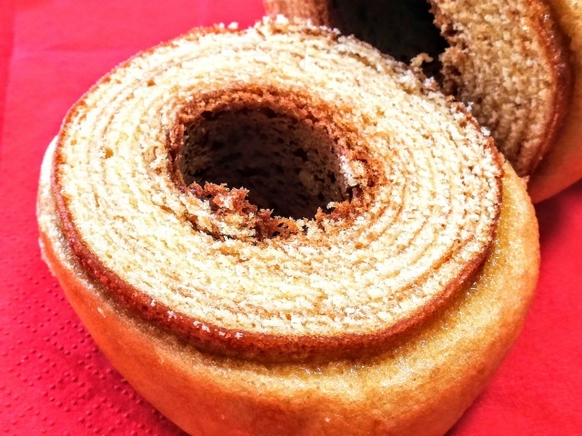 生地はシットリ、キメが粗く、バウムクーヘンぽくない。表面に砂糖のジャリっとした食感と甘さがチョットあり、そこは美味しい☆ でも全体としては・・・リピートはなしかな?
