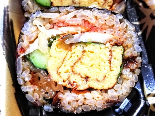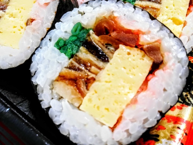 鰻蒲焼き、玉子、干瓢、胡瓜、椎茸、大葉、でんぶがイン。鰻が少なく中国産なのは、お値段的に想定内。フツーに美味しいが、でんぶの味が強すぎて、鰻の味が全く分からない。でんぶは入れないほうがいい。