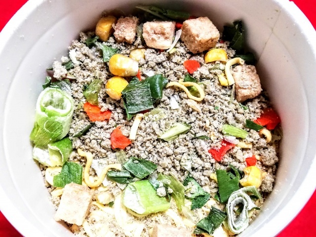 お湯を注いで3分後、更に緑色の勢力増でギョギョッ。