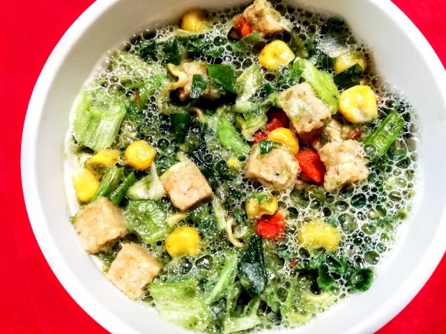 とろみのある緑色のスープが麺に絡んで、麺も緑色に。