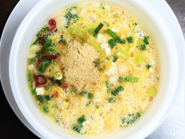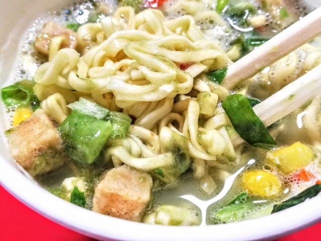 スープはしっかり鶏の出汁がきいていて、抹茶はほんのり風味づけ程度。奇をてらった商品だけど、きちんと美味しい。上品とパンチ力の融合、みたいな?