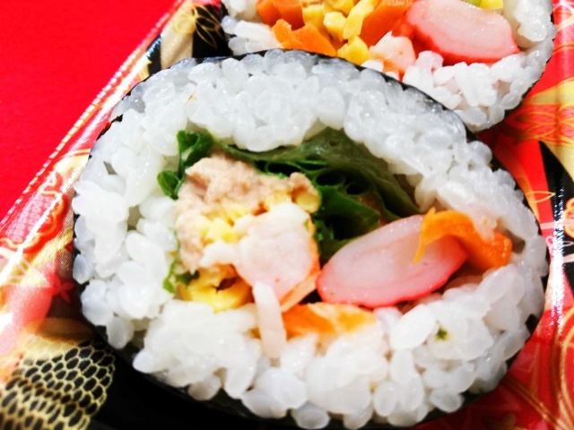 レタス、ツナ、カニカマ、玉子焼き、生サーモンがイン。シャリ多め。レタスのサラダ巻のほうが好き。