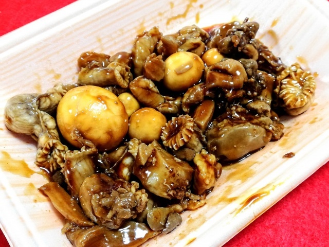 レバーやらキンカンやらタマヒモやらが、焼鳥のタレっぽい味付けで煮込まれている。いろんな食感で美味しい。