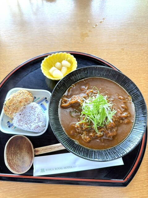 カレーうどんとおにぎり。うどんは細麺にしました。
