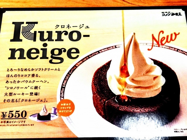 名前の由来は、ココア色のバウムクーヘンの上に白い雪山のようなソフトクリームが乗っている見た目。クロ(ココアの濃い色合い「黒」)と、フランス語で“雪"を意味する“ネージュ"を組み合わせて名付けている。コメダの定番メニュー「シロノワール」と同じく、温かいバウムクーヘンと、冷たいソフトクリーの“温"と“冷"の相反する2つの組み合わせという意味も込められているという。