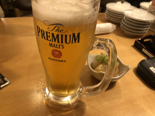 店内はカウンターとテーブル・座敷があり、職人さんが目の前で握る様子を眺めながら生ビールで乾杯。泡たっぷりのプレモルがすぐに提供され、冷え具合も申し分なしです。