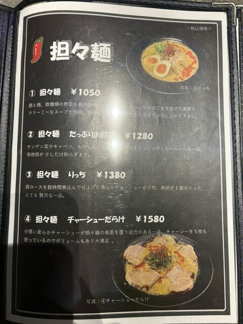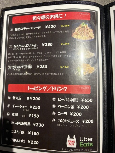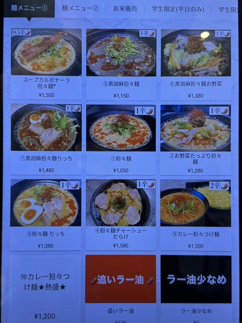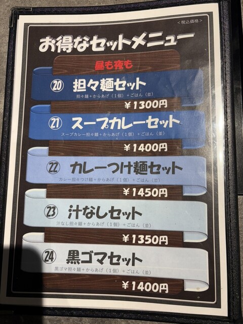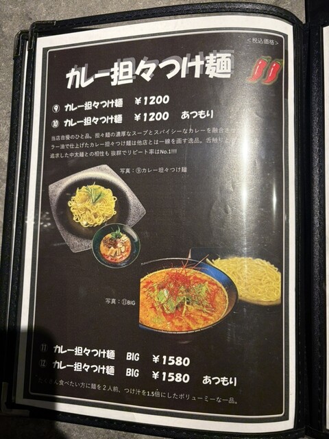 お店に入り食券機の横に置いてあるメニューを拝見、種類が多くどれにするか迷いましたが1番人気と書かれていた「カレー坦々つけ麺」(1,200円)の食券を購入、空いていたテーブル席に座り着麺を待ちます。