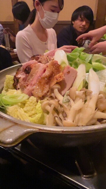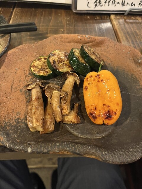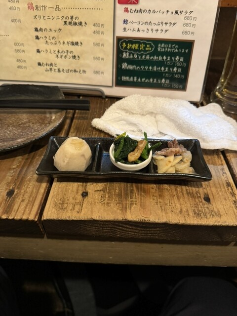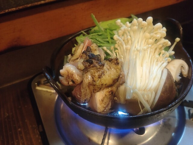 鯨の盛り合わせ、手羽揚げ、皮付きセセリの炭焼き、鶏鍋、季節の焼き野菜を注文。