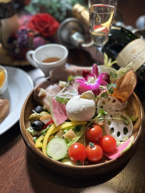契約農家直送の良質な野菜を使った料理が自慢。シャルキトリーボードなどお酒に合う一品も豊富ですので、イタリアから仕入れるワインとご一緒にどうぞ。季節の果物を用いたパフェもございますので、食事やお酒の〆に夜パフェを楽しむのもおすすめです。アンティーク調の装飾が彩るこだわりの空間は、主催のワイン会のほか撮影会、音楽イベント、パーティーなどレンタルスペースとしてもご利用可能。貸切もお気軽にご相談ください。