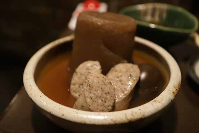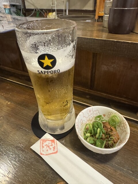 まずはお通しに地鶏のポン酢和え。