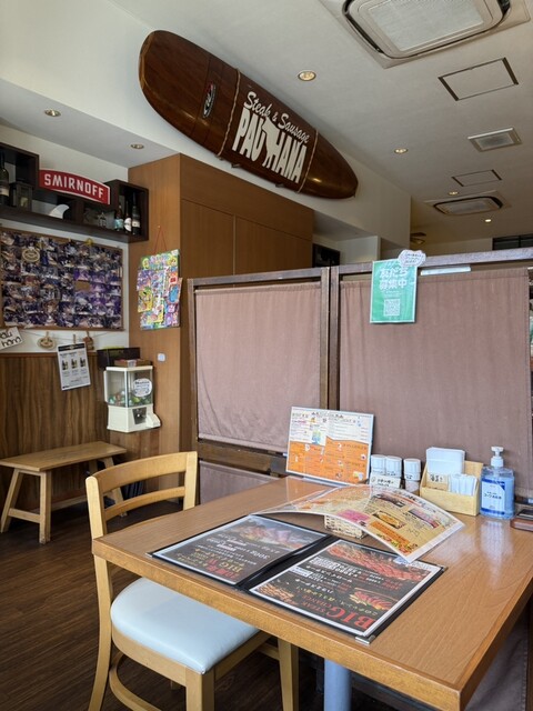 木の温もりが感じられる店内。さりげなく飾られたサーフボードが印象的で、リラックスしながら食事を楽しめる空間です。