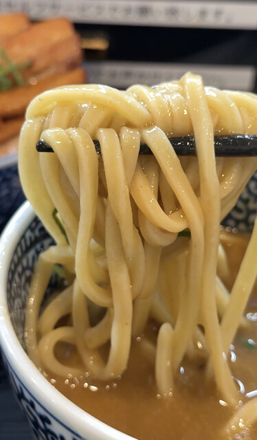 土曜日の昼過ぎに訪問。待ちはいなかったものの店内は満席で外の椅子で待ちました。お店の物と思われる傘が何本も置いてあり、雨天や日除けにお使いくださいということかな?一組待ちのためすぐに入店。太麺のため1...