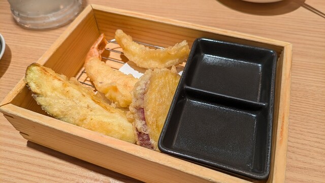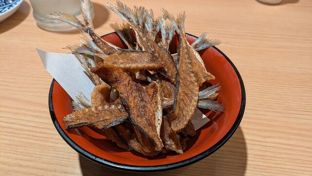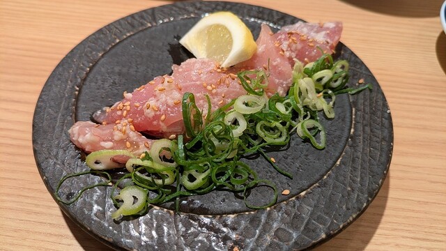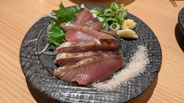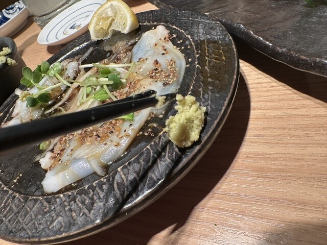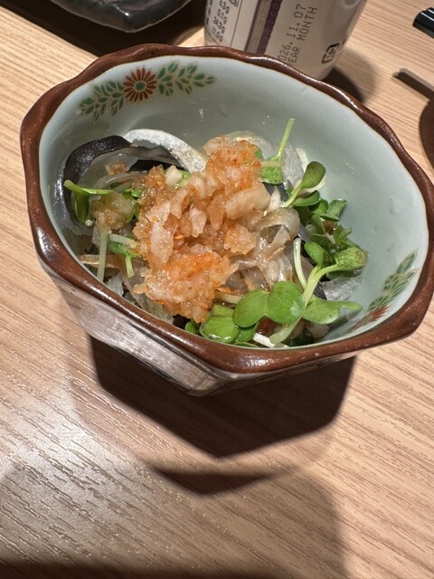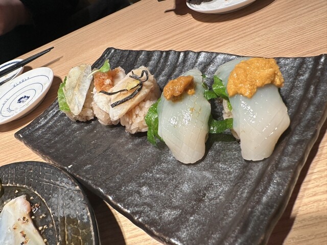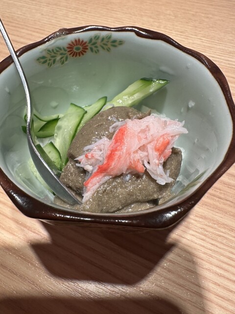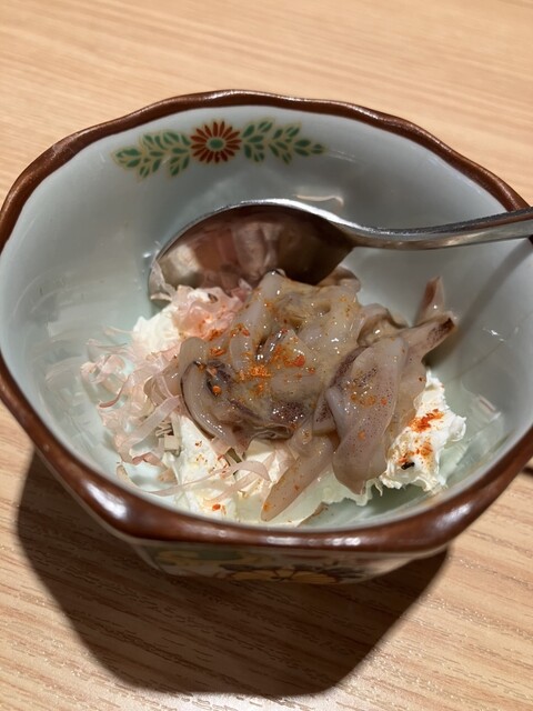 最初に提供されたアジの骨せんべいは、なめろうをつけて食べるスタイルで、香ばしさと旨みが相性抜群。生タコのカルパッチョは薬味がたっぷりで、さっぱりしながらも食べ応えあり。塩雲丹をのせ...